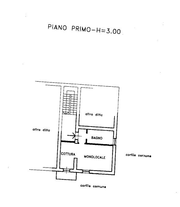 Appartamento monolocale di 43mq, sito al primo piano senza ascensore, così composto: ingresso su disimpegno, bagno, unico locale giorno/notte, cucina con balcone.