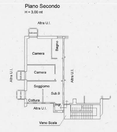 Appartamento trilocale di 67mq. sito al piano secondo in stabile senza ascensore, così composto: Ingresso, soggiorno con cucina a vista, due camere da letto, bagno e tre balconi. Completa il lotto un vano cantina al piano primo interrato.