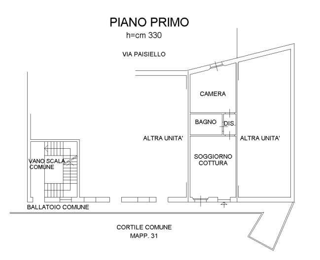 Appartamento bilocale di 51mq. sito al piano primo in stabile senza ascensore, così composto: Ingresso, soggiorno con angolo cottura, camera da letto e bagno. Completa la proprietà un vano solaio.