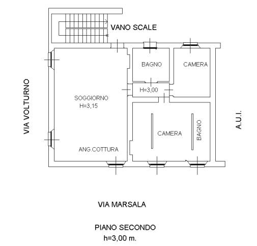 Appartamento trilocale di 102mq, posto al piano secondo senza ascensore, costituito da ampio soggiorno con angolo cottura, disimpegno, bagno, cameretta e camera matrimoniale.